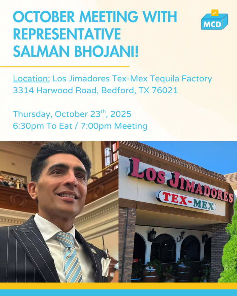 You’ve got questions and Rep. Salman Bhojani has answers. Join us for our meeting in October featuring House District 92’s own state representative!