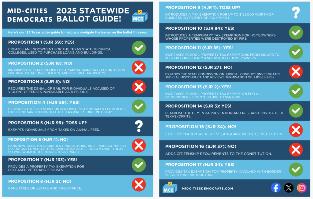 And everyone will have the opportunity to vote on 17 amendments to the Texas Constitution. At our Thursday meeting, we will discuss each amendment, and deliberate as a group how area Democrats should vote. The results will be shared via email and social media.