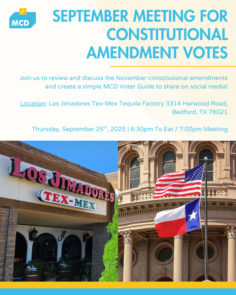 Join us for our meeting in September to discuss our November 2025 election items. There’s a special election for Senate District 9 featuring one Democrat—Taylor Rehmet. And everyone will have the opportunity to vote on 17 amendments to the Texas Constitution. At our Thursday meeting, we will discuss each amendment, and deliberate as a group how area Democrats should vote. The results will be shared via email and social media. Be sure to attend to have your say! Invite a friend or neighbor, socialize with area Democrats, and let’s win elections to improve and save lives! Thursday, September 25, 2025 6:30 pm to eat, visit 7:00 pm meeting Los Jimadores 3314 Harwood Road Bedford, Texas 76021 |